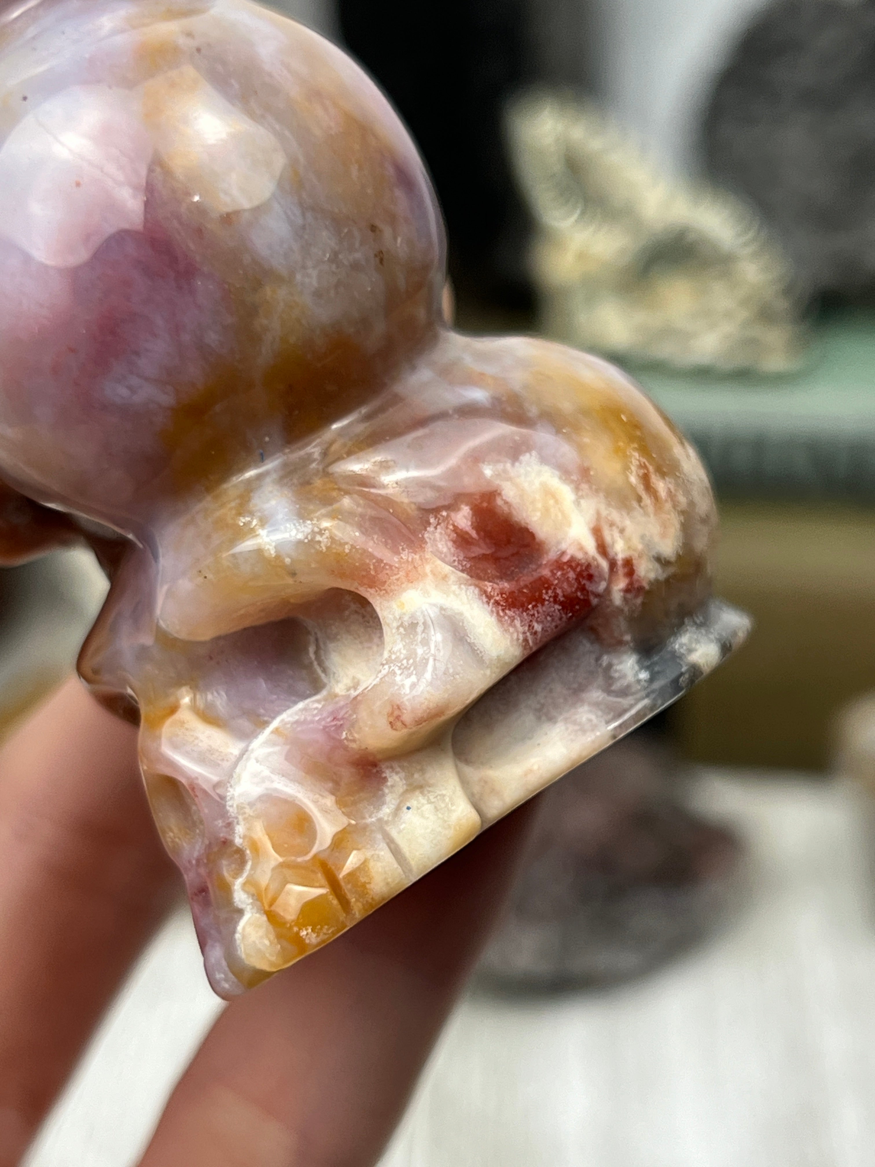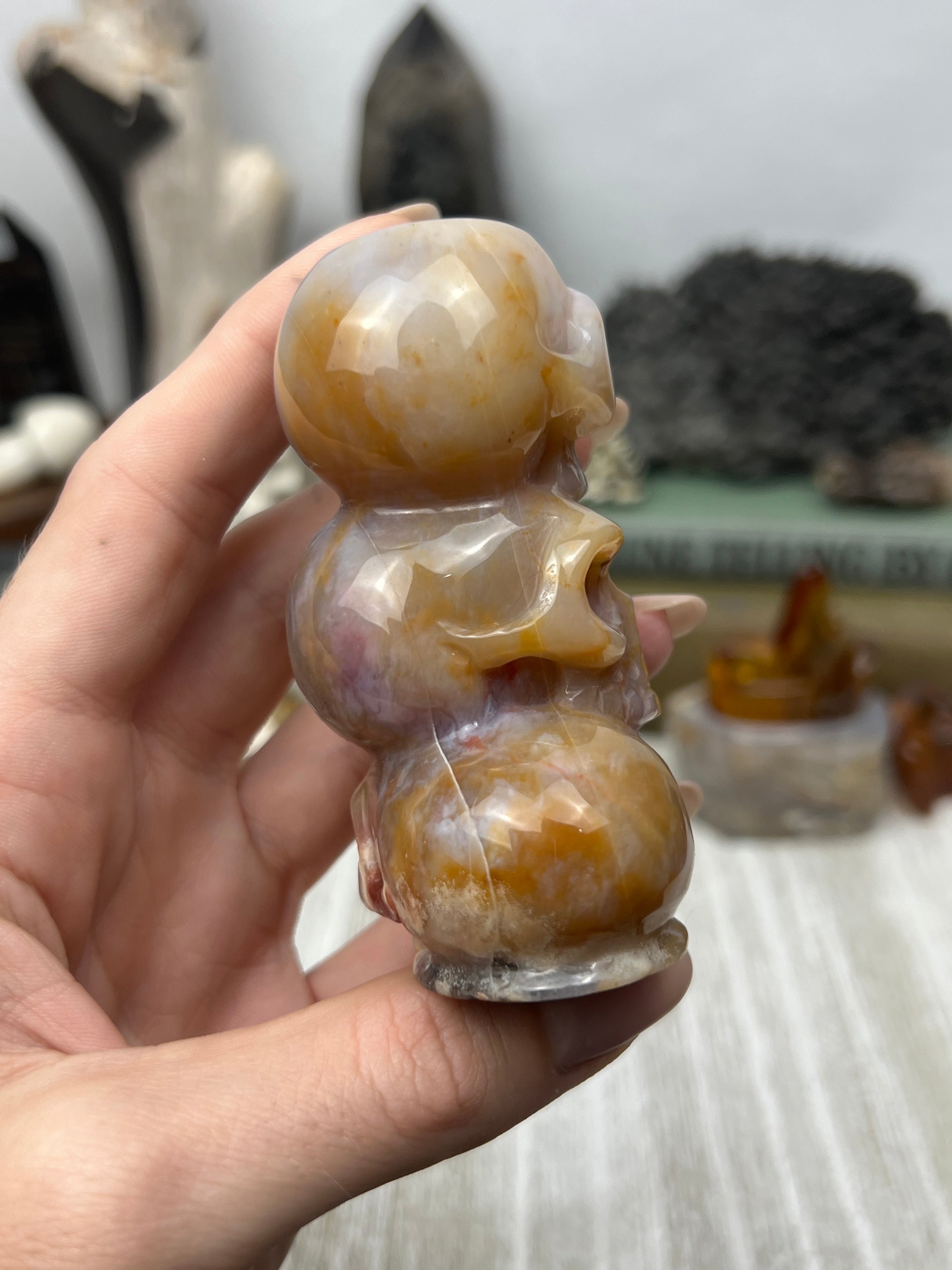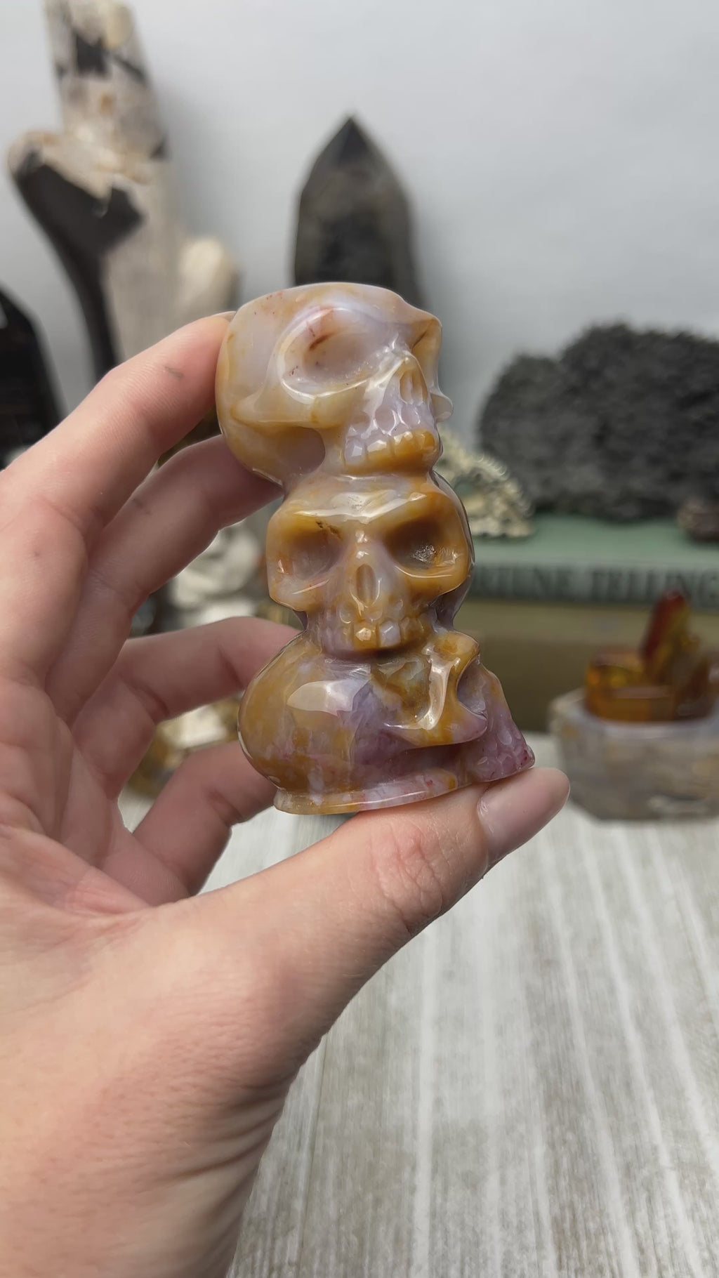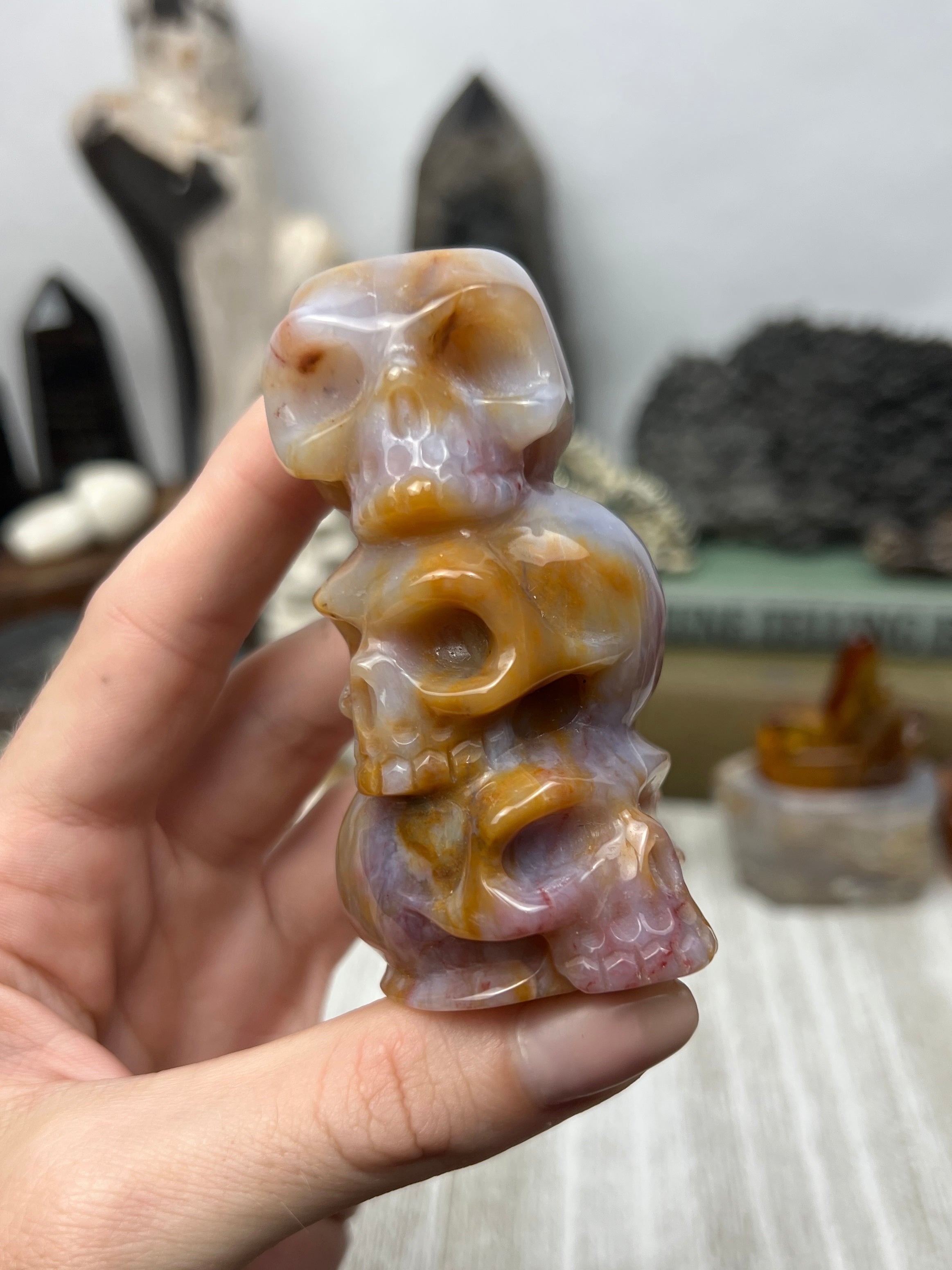 Blue chalcedony, in mottled tones of red and brown running through the glowing, semi-translucent pale blue material. Each one is a totally unique sculpture in the round with a small concave depression on the top of the triple skull stack to facilitate its use as a sphere or candle holder.