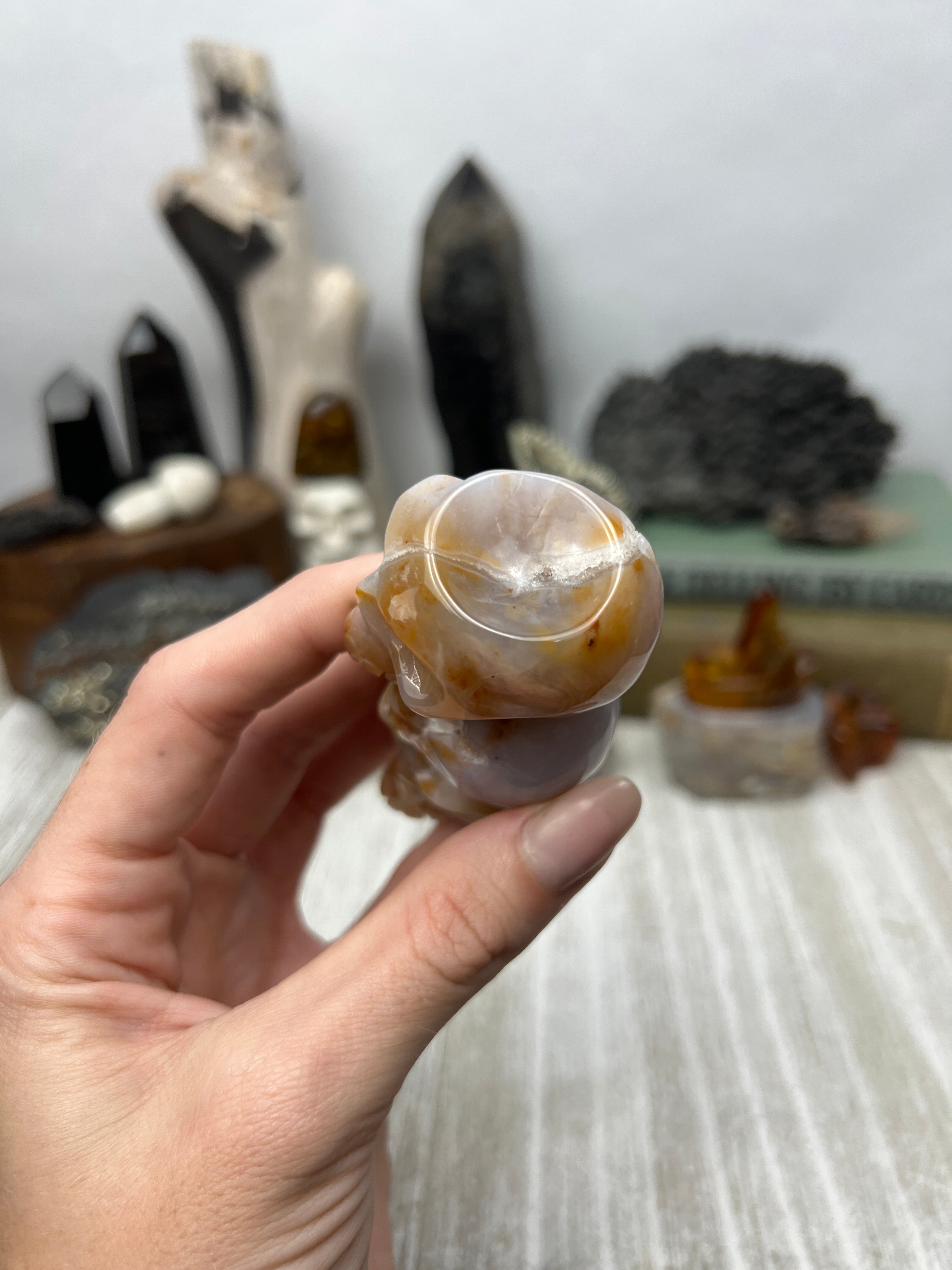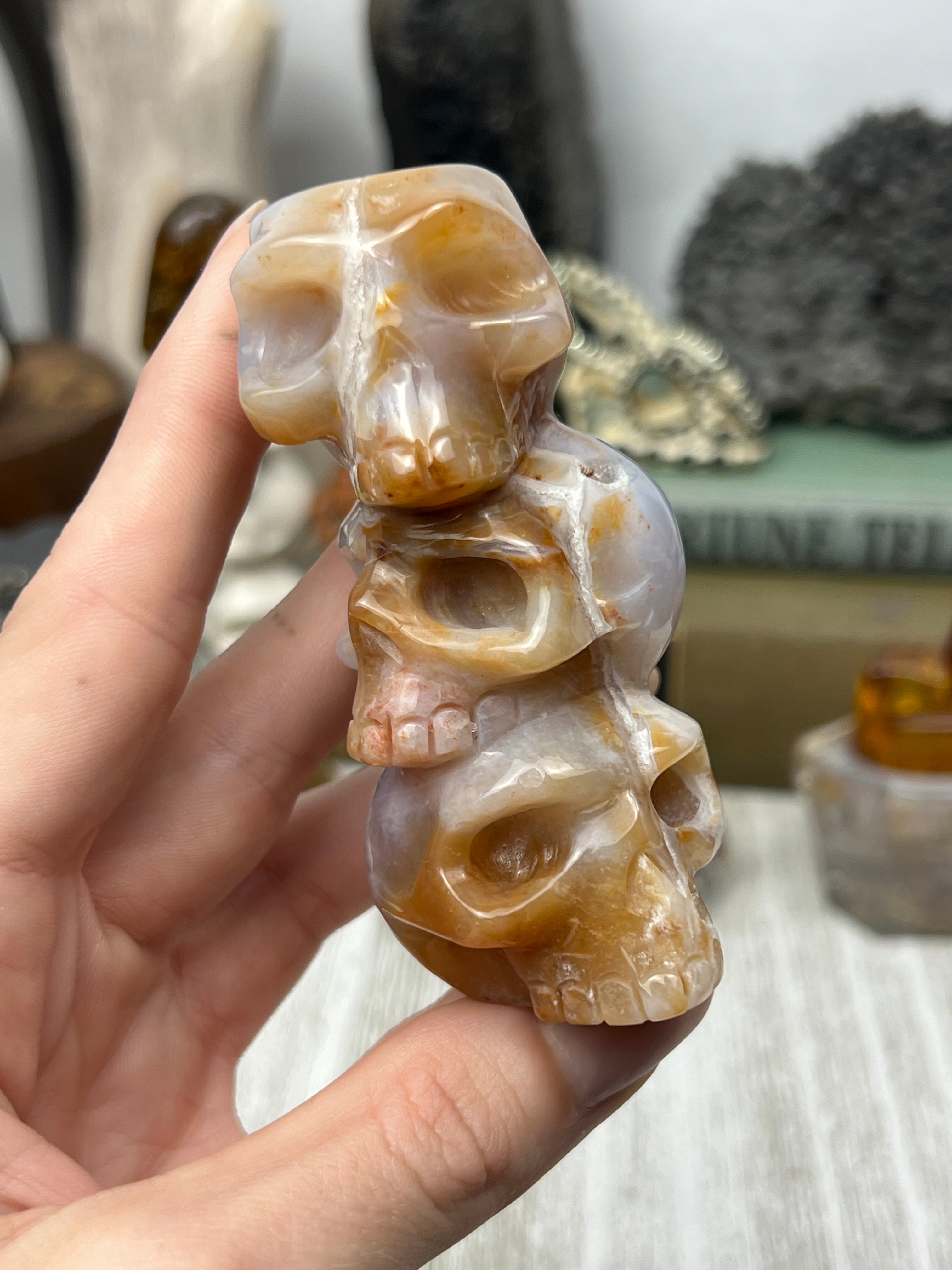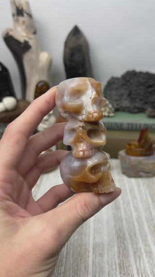 Blue chalcedony, in mottled tones of red and brown running through the glowing, semi-translucent pale blue material. Each one is a totally unique sculpture in the round with a small concave depression on the top of the triple skull stack to facilitate its use as a sphere or candle holder.