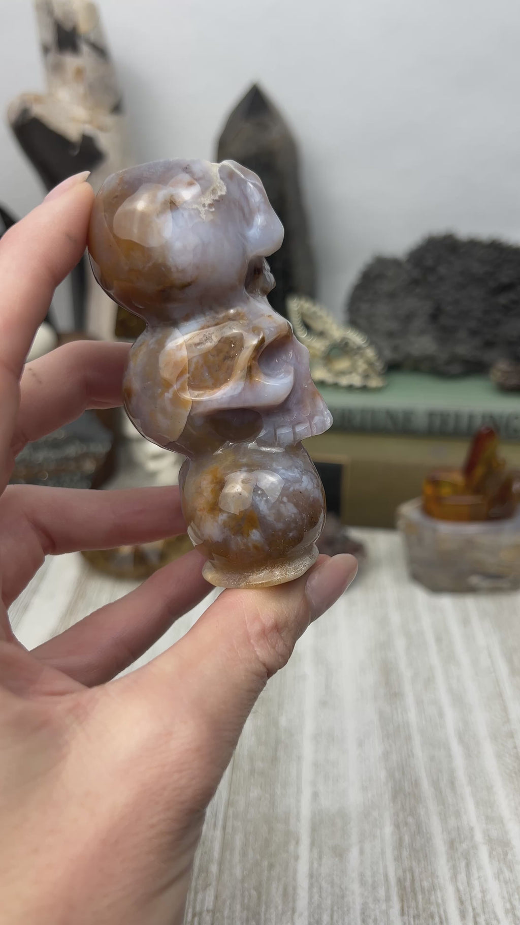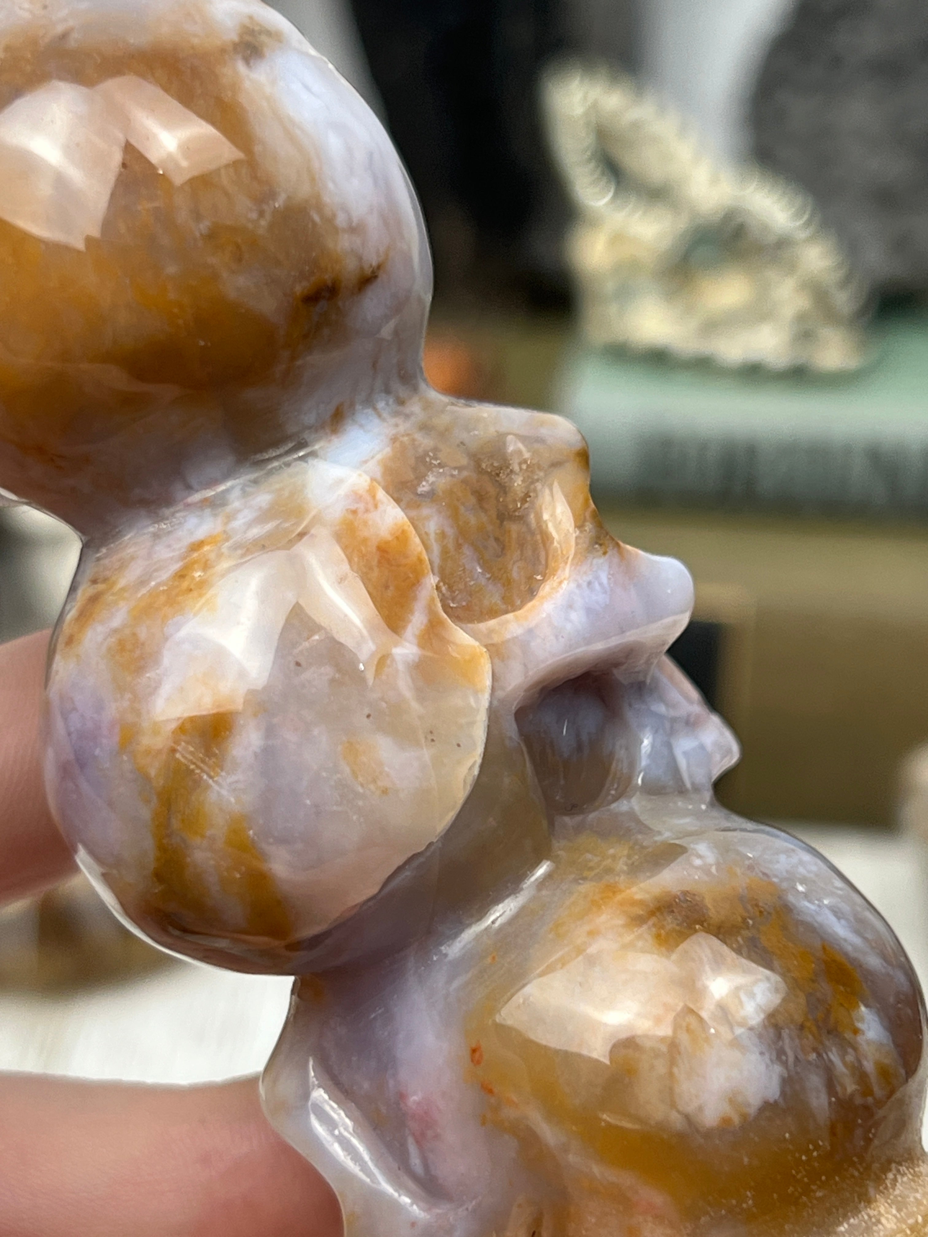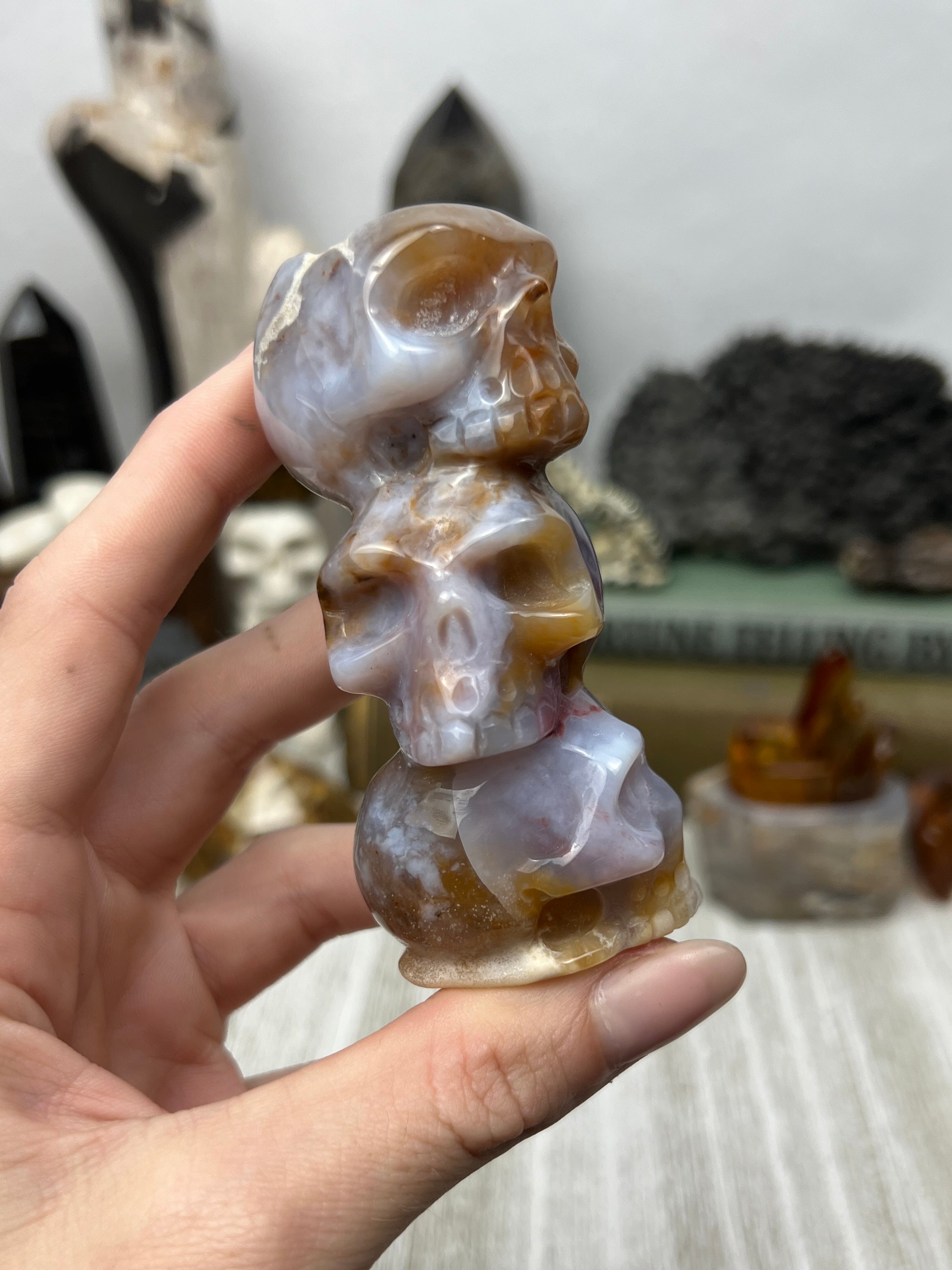 Blue chalcedony, in mottled tones of red and brown running through the glowing, semi-translucent pale blue material. Each one is a totally unique sculpture in the round with a small concave depression on the top of the triple skull stack to facilitate its use as a sphere or candle holder.