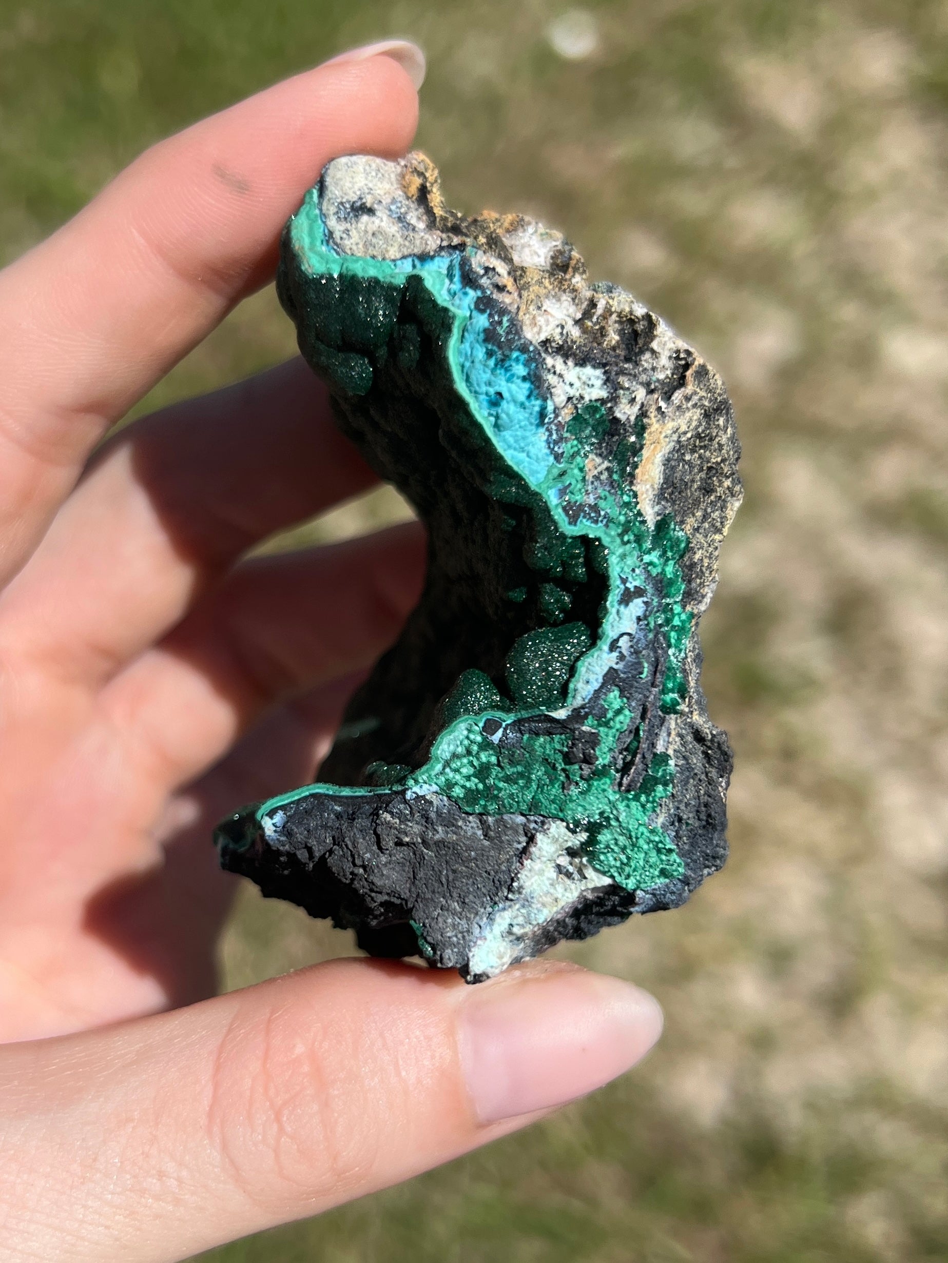 Malachite is known for its beautiful green color, which is caused by the presence of copper in its chemical structure. The color of malachite can range from a pale green to a dark, almost black green, depending on the amount of copper present. Copper is used as an amplifying metal which lends Malachite its metaphysical properties of amplification of intention, making it perfect for manifestation and prosperity work.